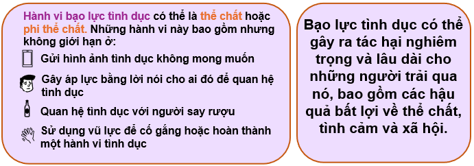 Hành vi bạo lực tình dục có thể là thể chất hoặc phi thể chất. Những hành vi này bao gồm và không giới hạn ở: